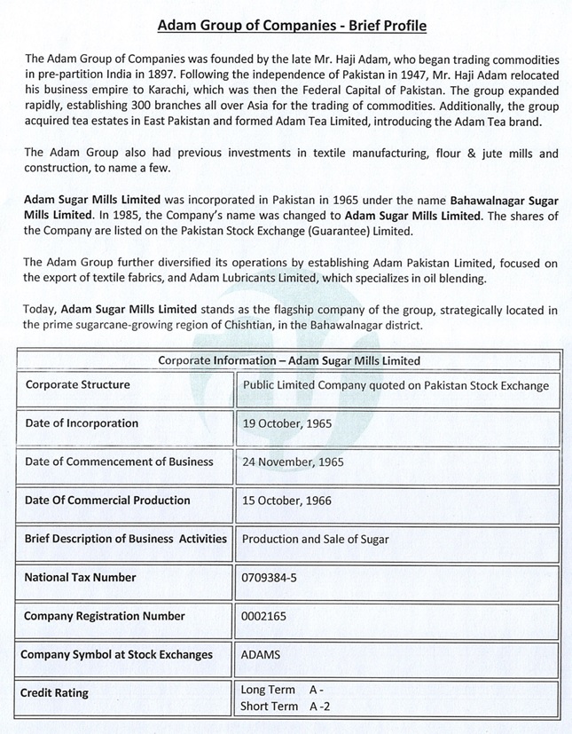 Adam sugar Mills limited ( the company) was incorporated in Pakistan in 1965, in the name of Bahawalnagar Sugar Mills Limited, as a Public Limited Compnay, in 1985, the name of of the Company was changed to Adam Sugar Mills Limited, The Shares of the Company as quoted on Karachi and Lahore Stock Exchanges. |
